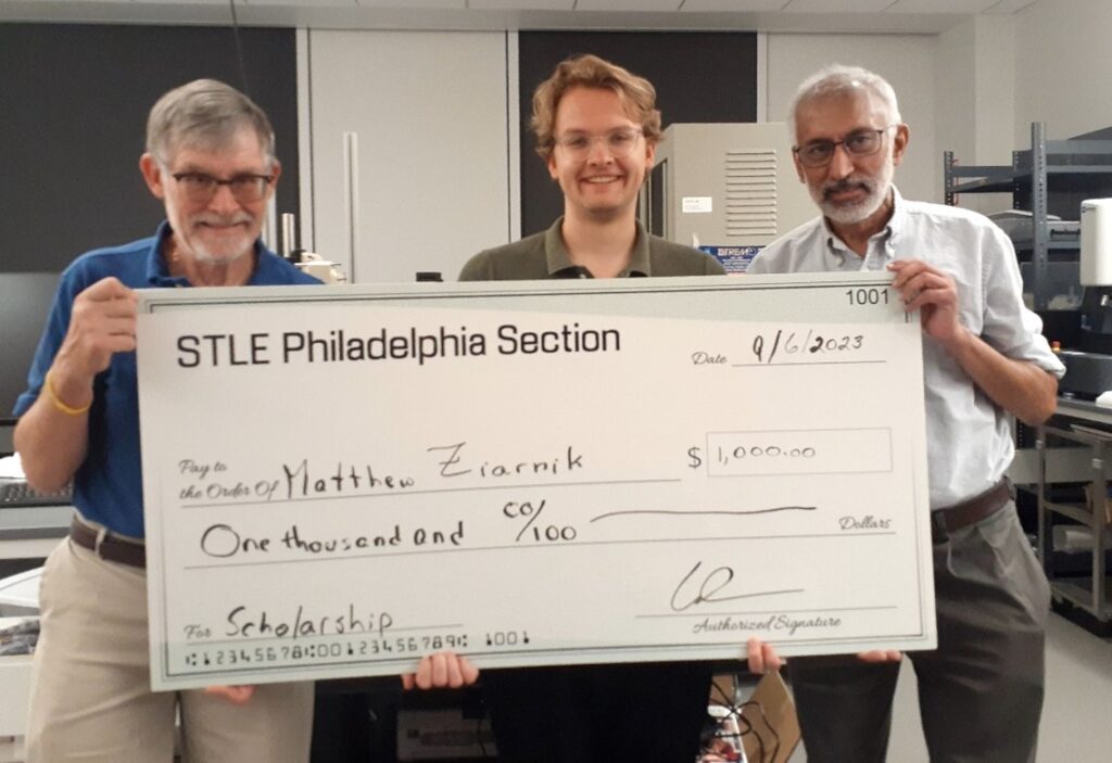 The Philadelphia Section of the STLE is pleased to award a $1,000 scholarship to second year Lehigh University Bioengineering graduate student Matthew Ziarnk. Working under the direction of Professor Anand Jagota, and in conjunction with Professor Xiaohui (Frank) Zhang, Ziarniik is looking at biological adhesion. Specifically, he has been working on viral adhesion and internalization in relation to the cellular glycocalyx both through simulations and experiments. Some of these experiments such as atomic force microscopy and biolayer interferometry focus on studying adhesion mainly between proteins. The simulations look at larger scale viral internalization with entire membranes. The reason for this work is that by studying the friction, adhesion, and compression of the cellular membrane and glycocalyx, targeted drug therapy could be used to minimize human illness. His contributions have already resulted in co-authorship on a published paper. His project is also part of a broader program at Lehigh on future pandemic prevention and he is actively involved in it.